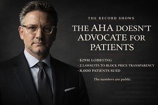 The AHA spent $29 million lobbying in 2024, lost two federal lawsuits defending hospital secrecy, and stayed silent while its own board chairman's…