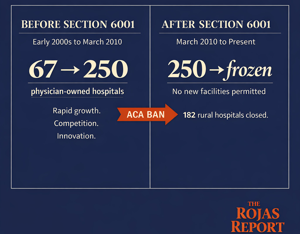 The provision banned new physician-owned hospitals from participating in Medicare. It froze existing physician-owned facilities in place. No new beds. No new operating rooms. No expansion.
