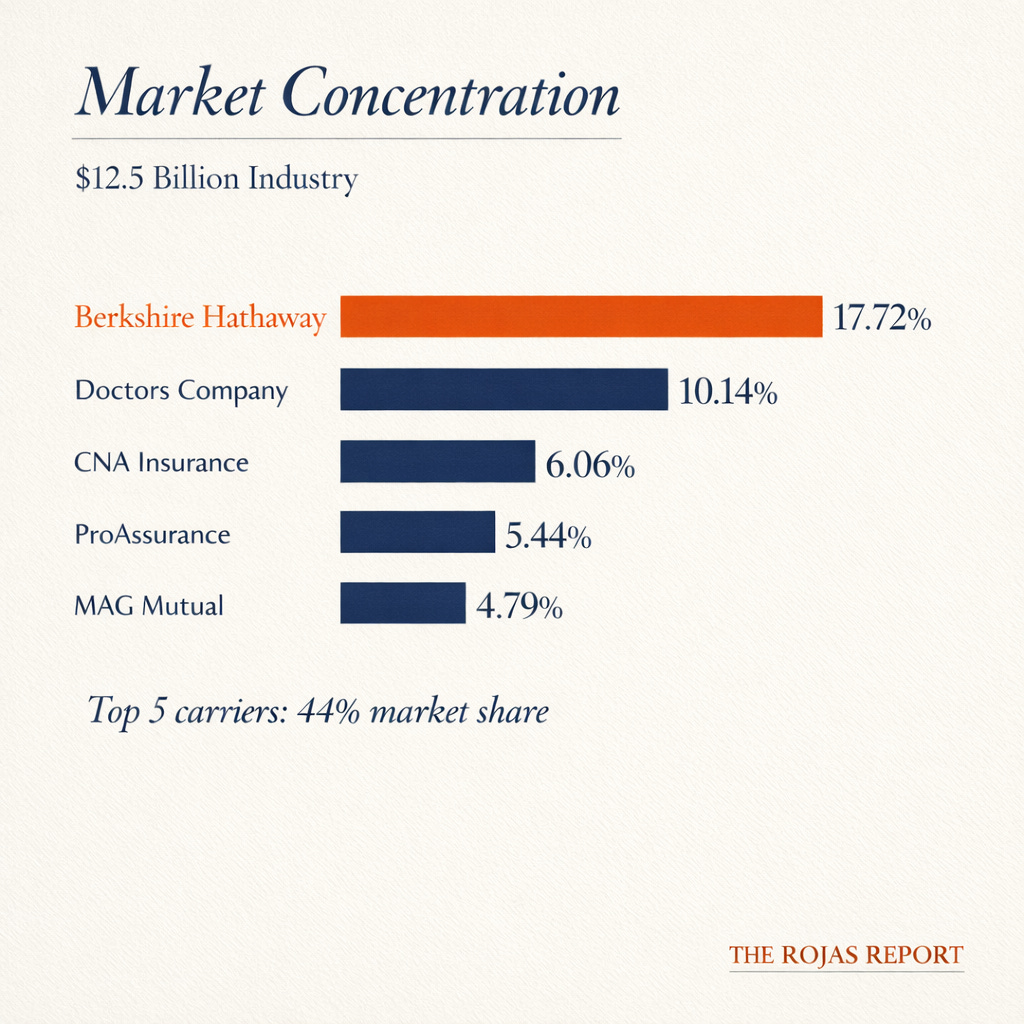 The top five carriers control approximately 44% of the malpractice insurance market: