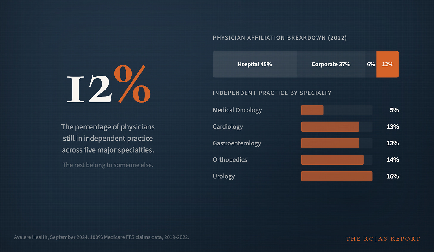 That is the percentage of physicians still in unaffiliated private practice across five of the highest-volume, highest-revenue specialties in American medicine: cardiology, gastroenterology, medical oncology, orthopedics, and urology.