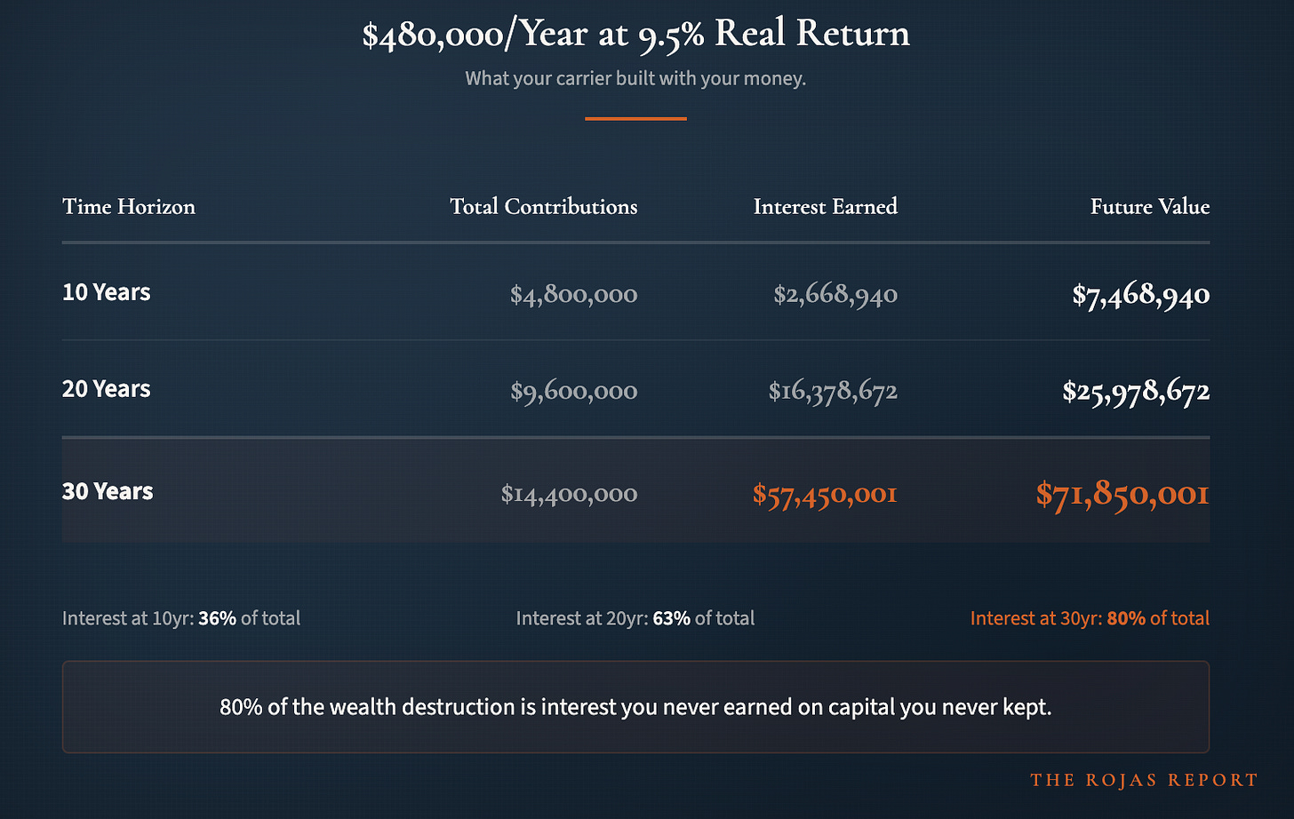 One practice. One career. $480,000 per year bled to insurance carriers for the crime of staying independent. Compounded over 30 years, 80% of the destruction is interest you never earned.