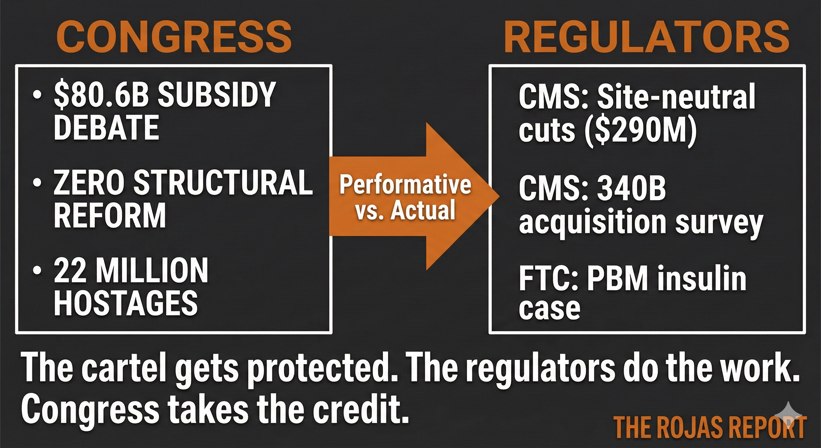 Pass site-neutral payment reform. Hospitals charge 2-3x more than independent physicians for the same service. The facility fee is pure extraction. Congress knows this. Congress does nothing.