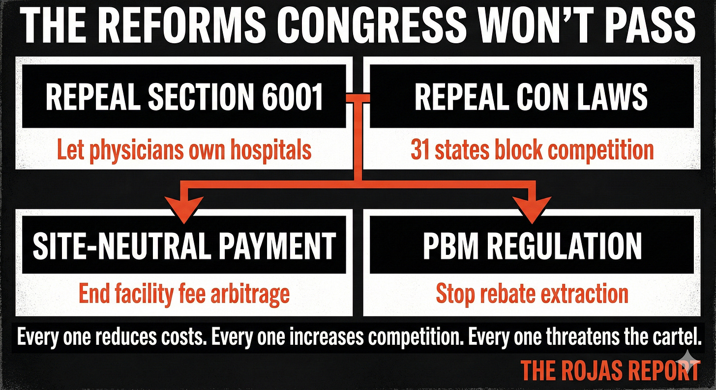 Repeal Section 6001. Let physicians own hospitals again. Before the 2010 ban, physician-owned hospitals had better outcomes, lower costs, and higher patient satisfaction. Congress banned them because they competed too effectively.