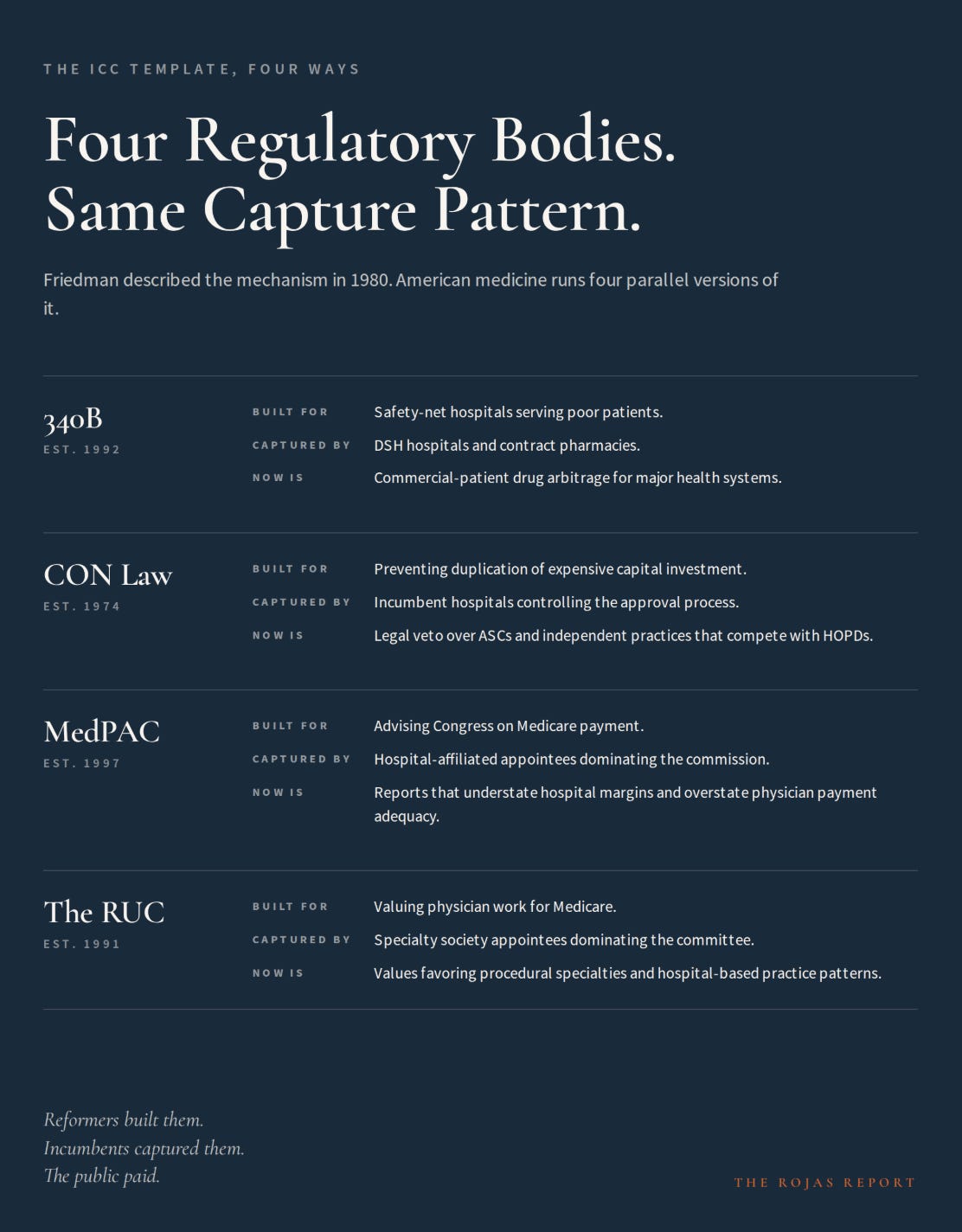 Twelve regulatory capture principles from one 1980 broadcast, each with a healthcare receipt