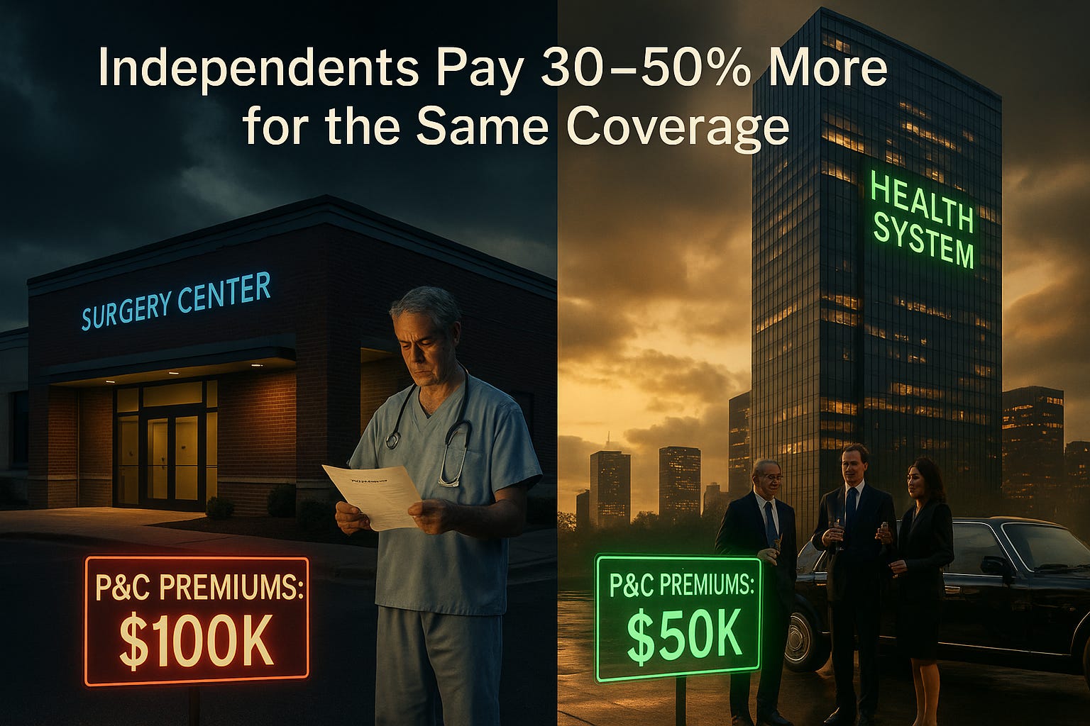 Large systems pay 30–50% less than independent physicians for the exact same coverage.