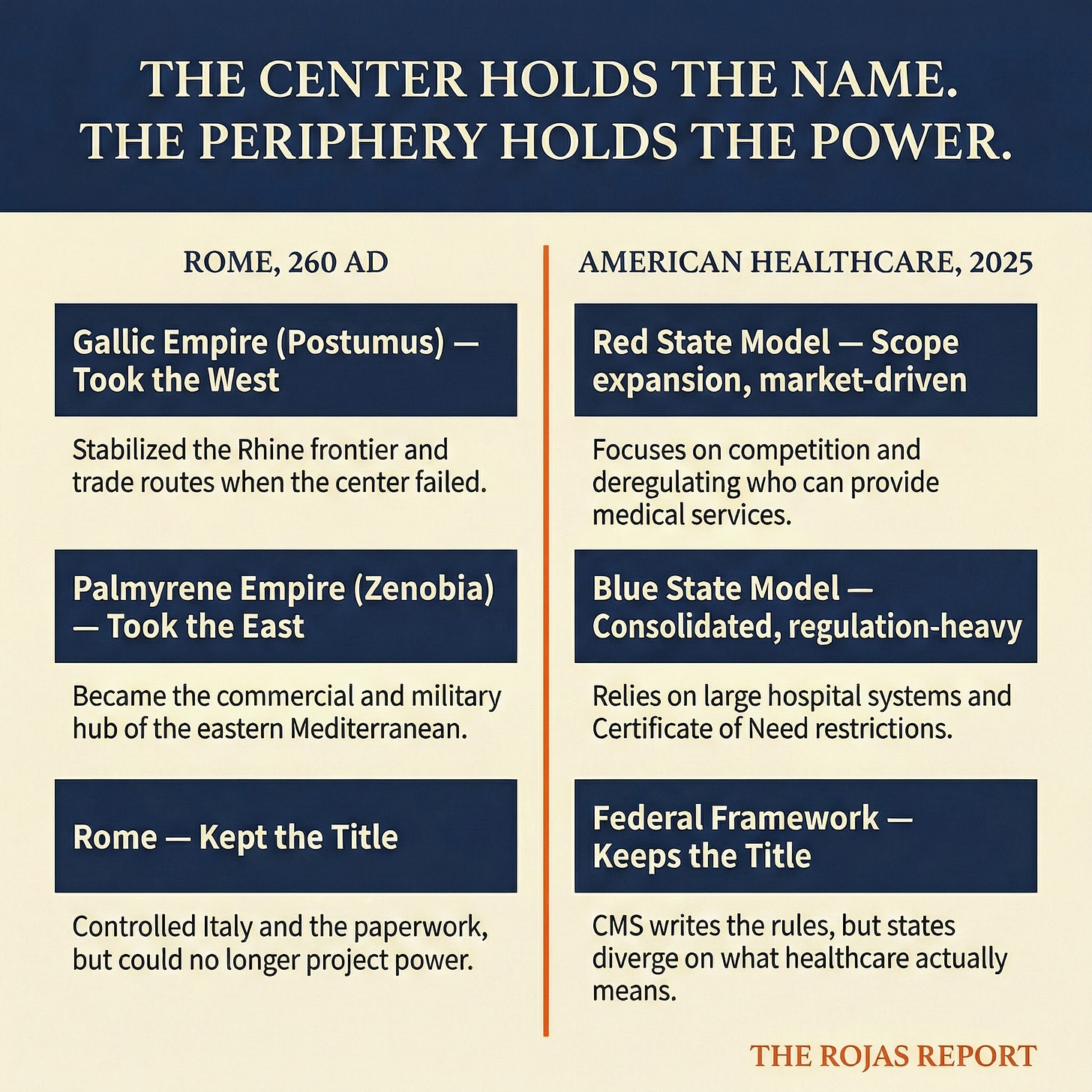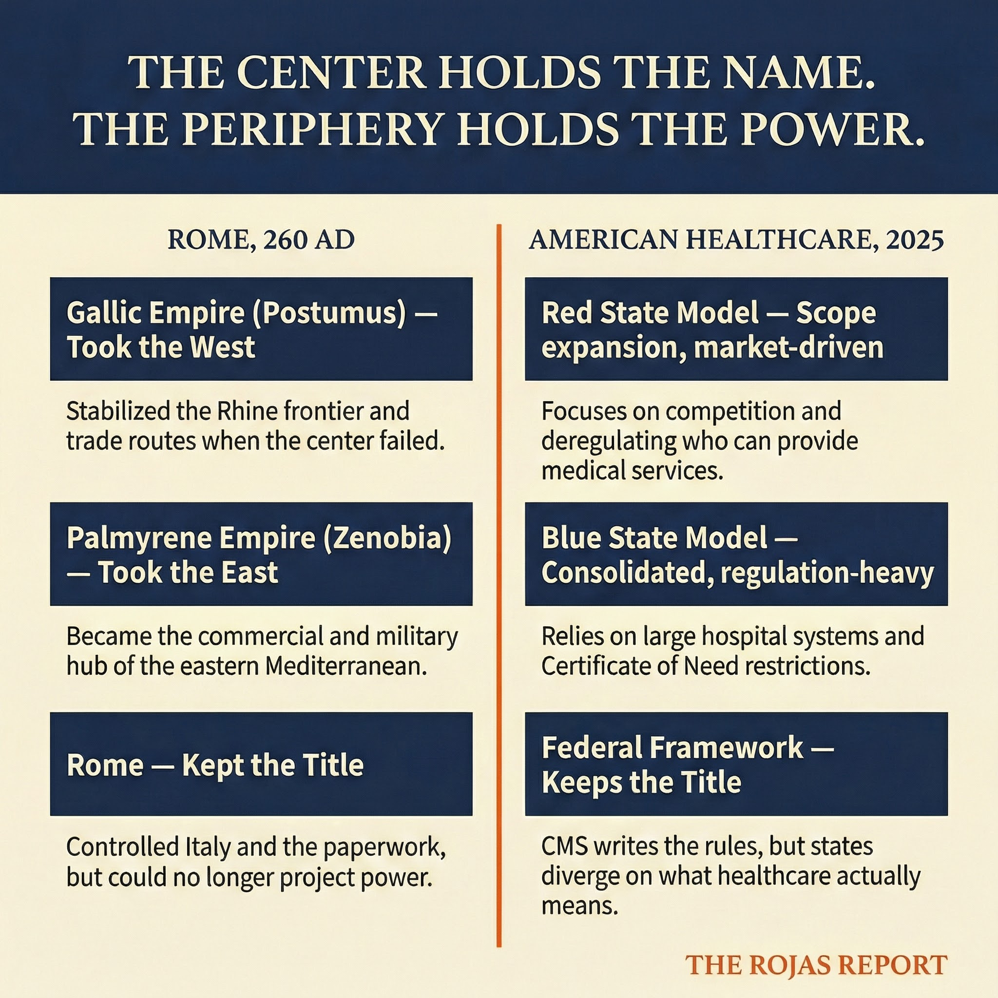 Postumus: Military commander who declared himself emperor of the Gallic Empire in 260 AD. Took Gaul, Britannia, and Hispania. Not through conquest. Through competence. He delivered what Rome couldn’t. The healthcare equivalent: states that build their own regulatory frameworks because the federal system stopped functioning.