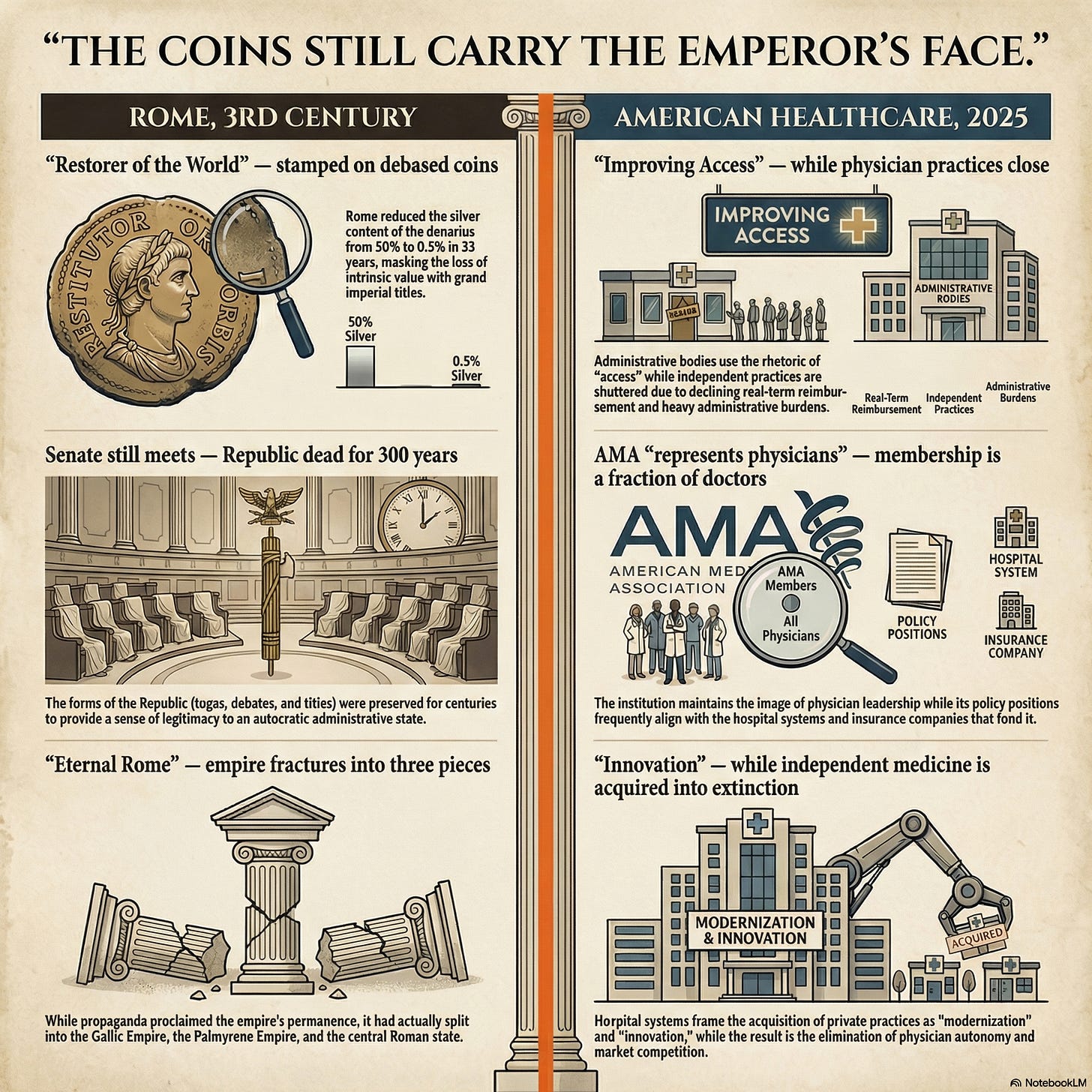 How the Roman Empire fractured, debased its currency, diluted its titles, and outsourced its military to the people who would replace it. The same sequence is running in American healthcare right now.