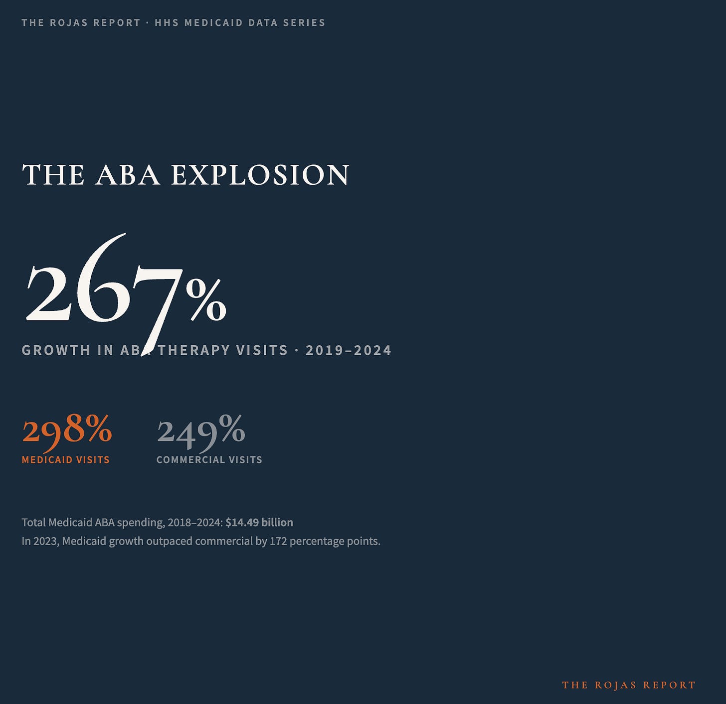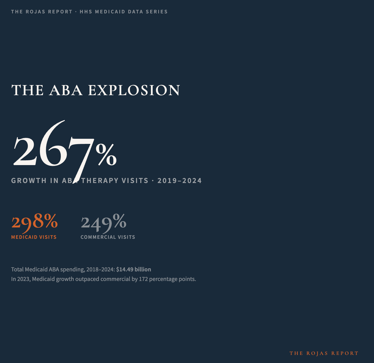 The nationwide volume of ABA therapy visits has grown 267% since 2019, according to Trilliant Health. Total Medicaid spending on ABA codes grew 279% from 2018 to 2024, reaching $14.49 billion across all states. Medicaid-covered ABA visits increased 298%. In 2023, Medicaid growth outpaced commercial insurance growth by 172 percentage points.