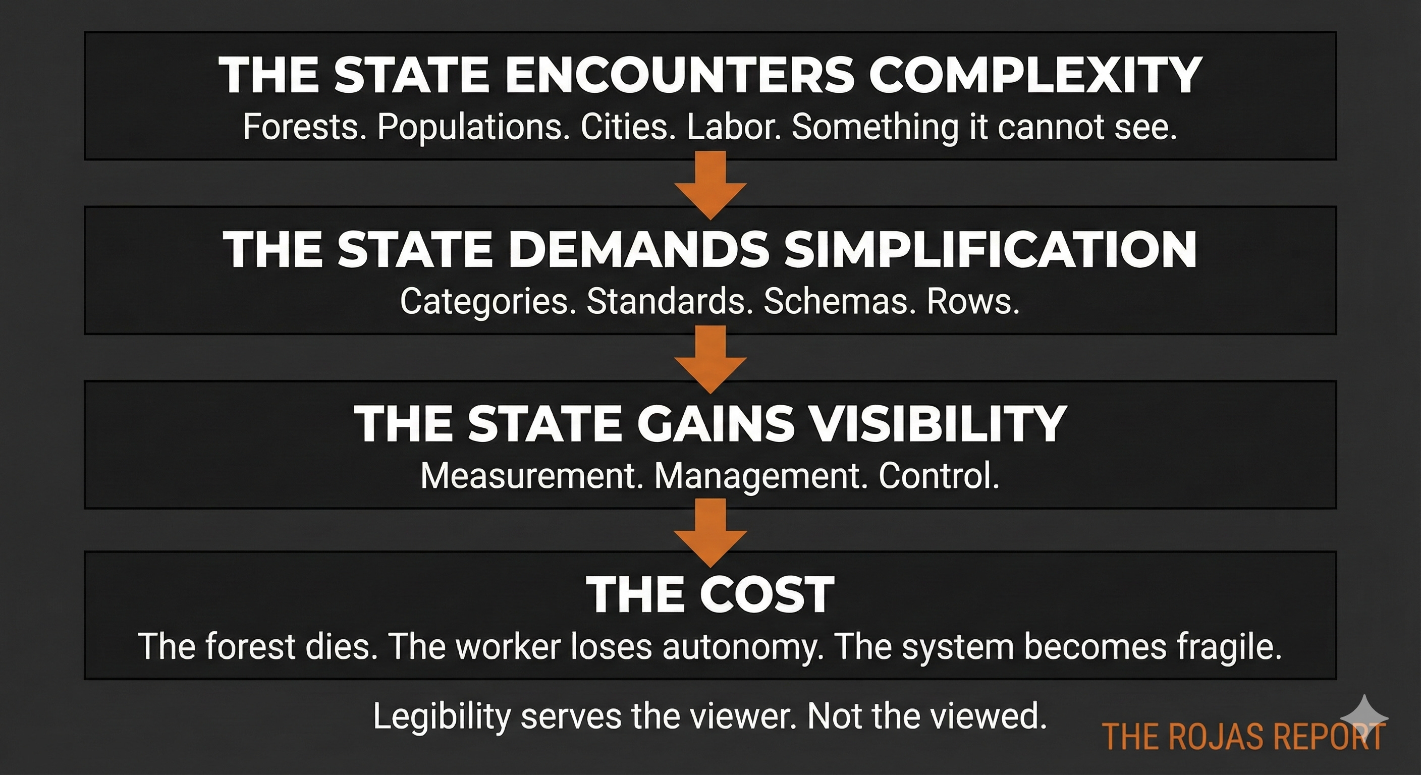 Legibility is not about good intentions or bad intentions. It is about the basic mechanics of administration. A bureaucracy that cannot measure cannot manage. So it demands measurement. Whether or not the measurement captures what matters.
