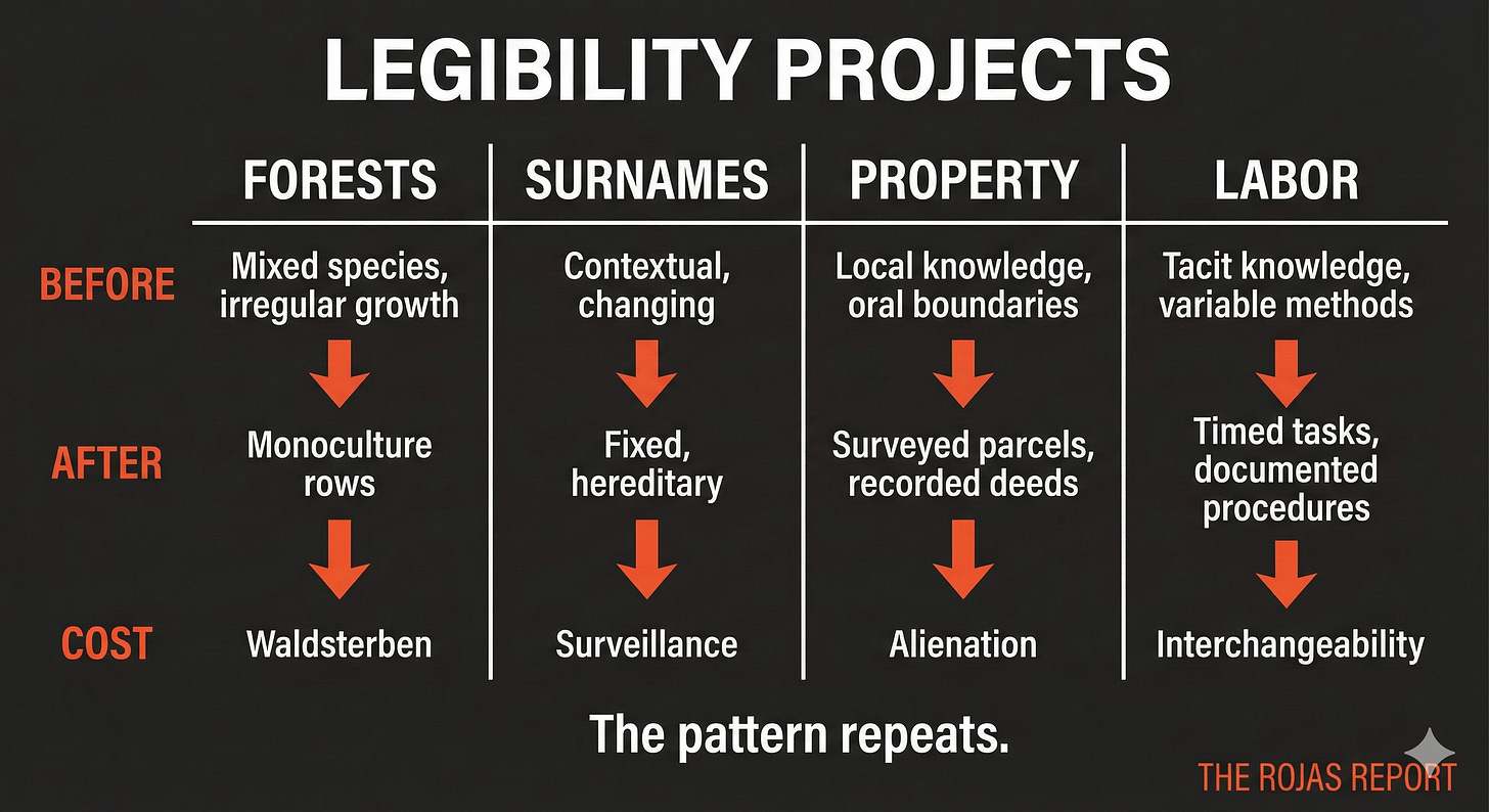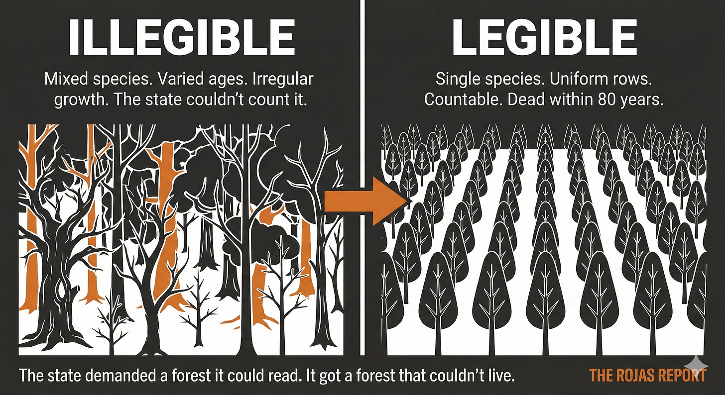 The Prussian forest was illegible. So the state made it legible. The resistance wasn’t ideological. It was structural. A central authority cannot act on what it cannot see.