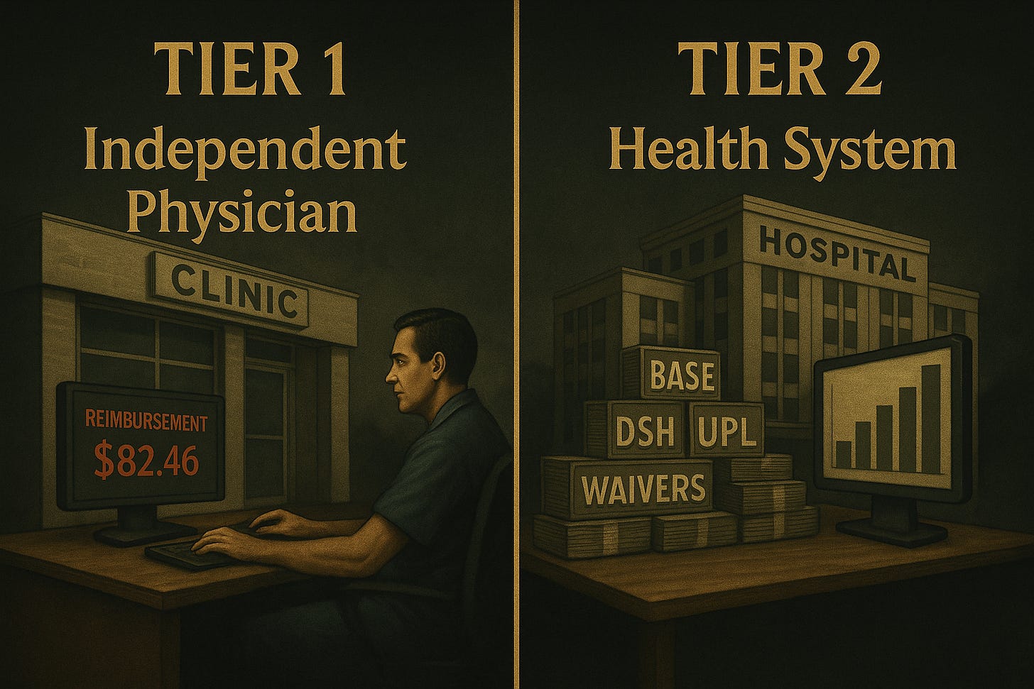 An independent physician may bill Medicaid $50 for a consult and receive $42 (after clawbacks and denials). A health system bills the same, then leverages supplemental channels to walk away with $250—plus the moral applause of having “served the underserved.”
