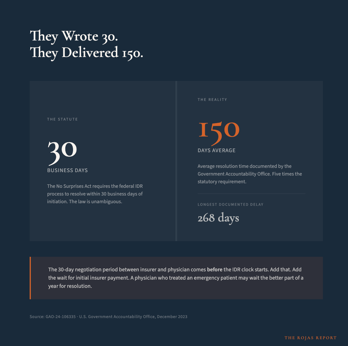 The 30-day mandatory negotiation period between the insurer and the physician occurs before the IDR process even begins. Add the wait before arbitration even starts. A physician who treats an emergency patient and cannot agree on payment with the insurer may wait for resolution for the better part of a year.