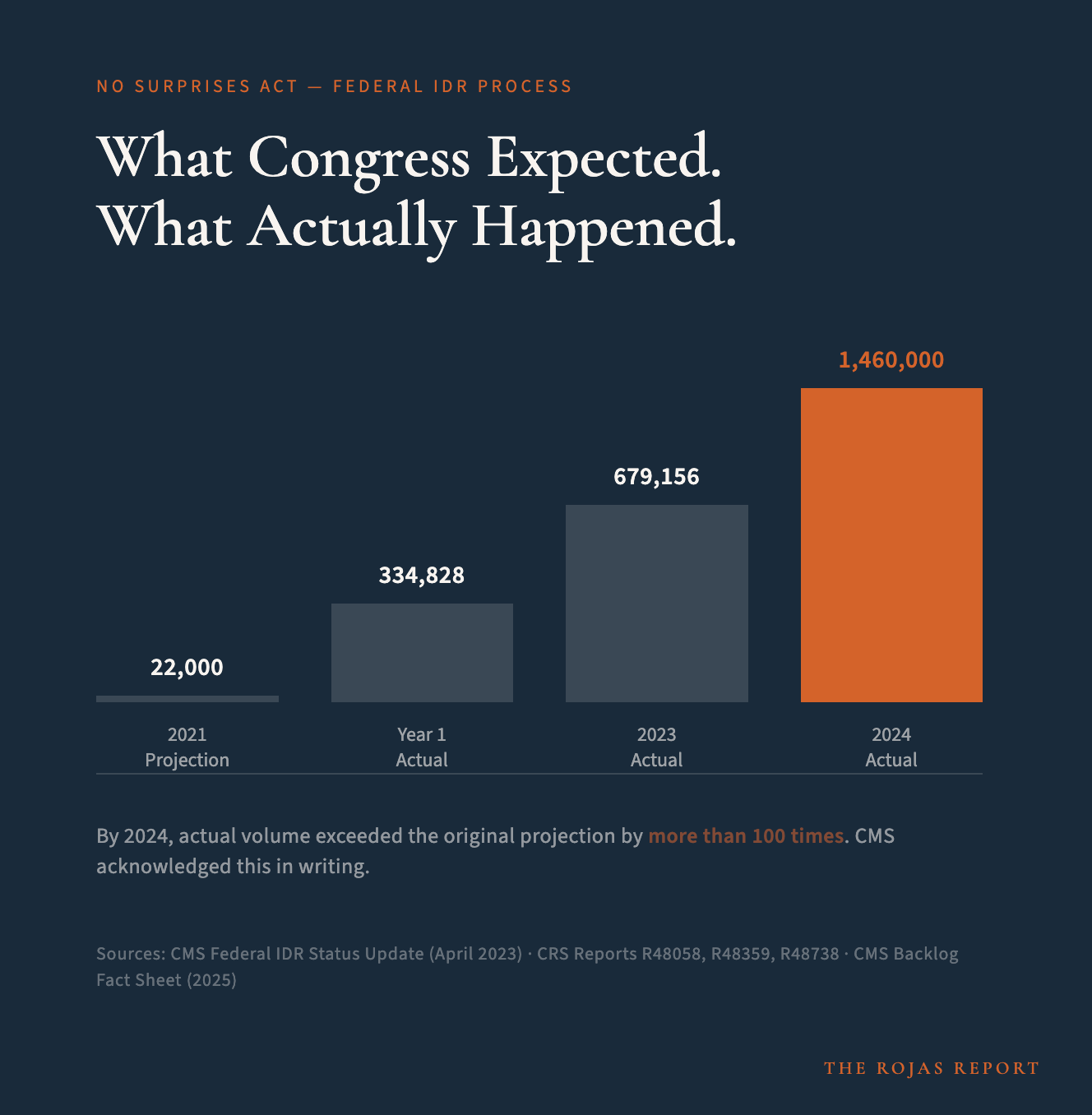 The No Surprises Act created a dispute resolution system built on a projection that was wrong by a factor of 100. The physicians treating emergency patients absorbed the consequences.